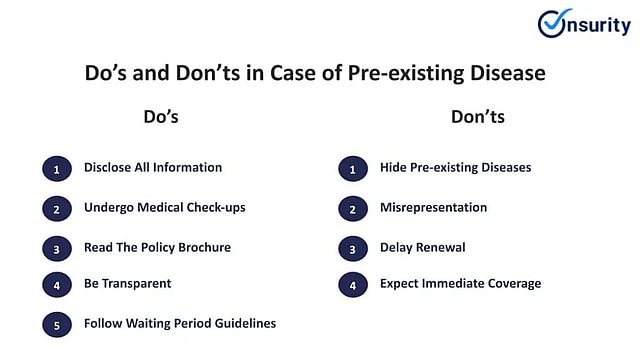 Terms and conditions can differ: The policies, terms and conditions for pre-existing diseases may vary from one insurer to the other, such as waiting period, coverage, riders, etc.